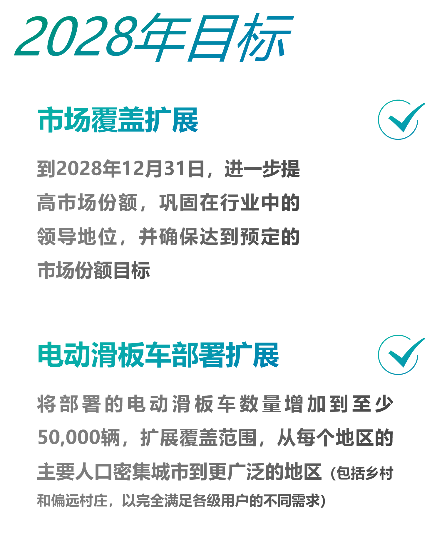 车辆投放规模:计划在全国范围内投放至少 50,000 辆共享电动滑板车,进一步推动共享出行系统的普及,提高居民出行效率,并创造新的本地经济发展机遇